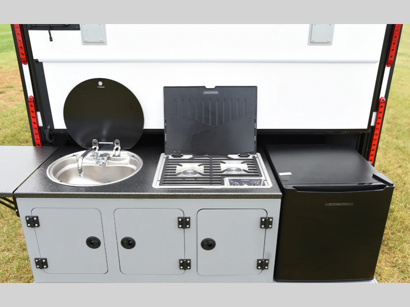 You won't find wood in any of the ROG's construction. Instead, Encore RV has opted to use aluminum and fiberglass to create a lightweight product that won't rust or corrode. You also won't find any wood in the kitchen cabinets because these are made of aluminum too, and there are solid surface countertops that are easy to keep clean.