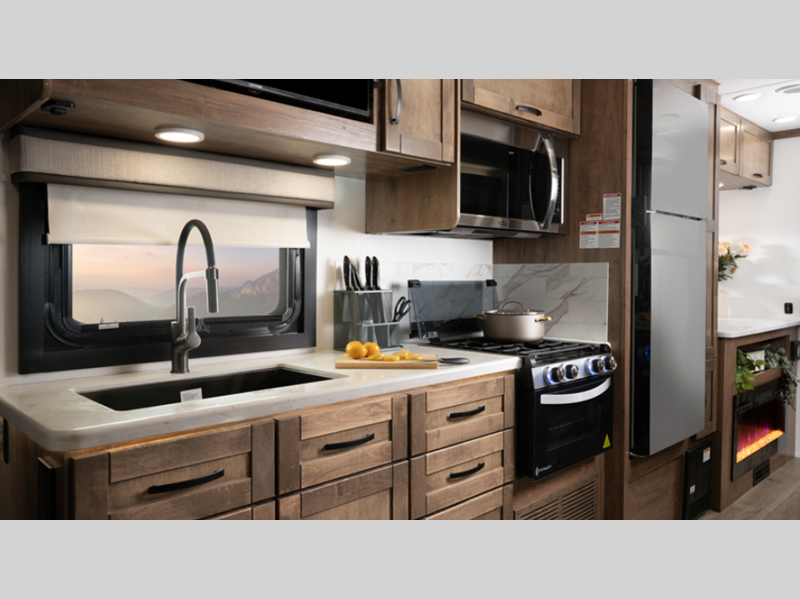 Sleeps 4 Slides 1 Length 31 ft 4 in Ext Width 8 ft 4 in Ext Height 12 ft 6 in Int Height 7 ft Interior Color Stillwater Exterior Color Partial Paint, Harvest Night, Night Shade, Summer Equinox, Winter Sky. Hitch Weight 12000 lbs GVWR 19500 lbs Fresh Water Capacity 53 gals Grey Water Capacity 31 gals Black Water Capacity 31 gals Tire Size 225/70R19.5 Furnace BTU 30000 btu Generator 6,000W generator with auto-gen start Fuel Type Diesel Engine 6.7L Power Stoke V8 Turbo Diesel Chassis Ford F550 4x4 Horsepower 330 hp Fuel Capacity 67 gals Wheelbase 212 in Number Of Bunks 1 Available Beds Queen Torque 950 ft-lb Refrigerator Type 12V Refrigerator Size 10 cu ft Shower Size 30" x 36" Number of Awnings 1 Axle Weight Front 7000 lbs Axle Weight Rear 14706 lbs LP Tank Capacity 56 lbs. Water Heater Capacity 10 gal Water Heater Type Gas/Electric AC BTU 15000 btu TV Info LR 50" LED HD Smart TV Awning Info 19' Electric with LED Lights Gross Combined Weight 31500 lbs Shower Type Standard Similar Floorplans