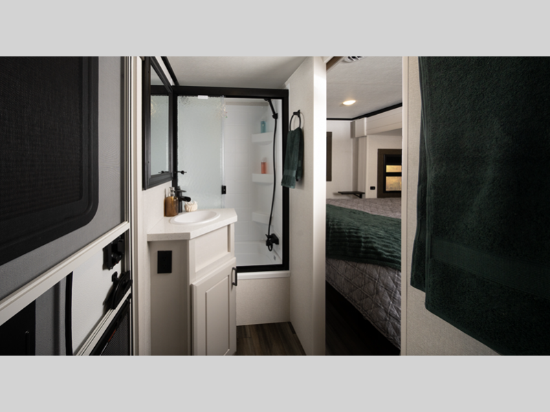 They come equipped with an impressive three 15,000 BTU A/C with quiet residential return air and a mandatory Four Seasons Package that will ensure your comfort year around, plus there are stainless steel kitchen appliances that give a residential touch to your space. The durable construction that includes a PVC roofing membrane will help extend the life of your fifth wheel, and the TravelLINK command system will put you in control of lighting, heating, and cooling for added convenience.